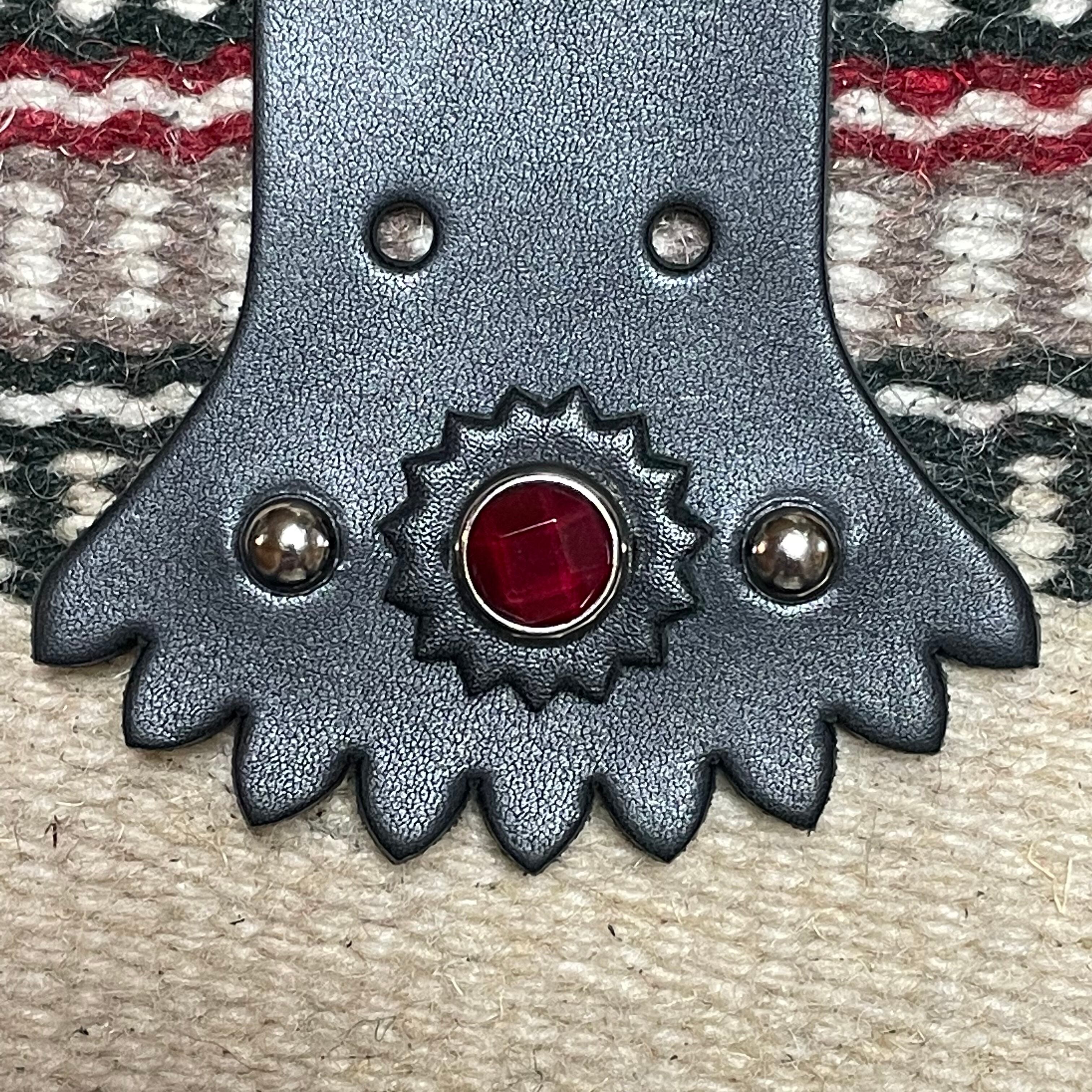 ブラックサドルレザーにガラスジュエルとロゼットとブラススタッズを打ち込みました。